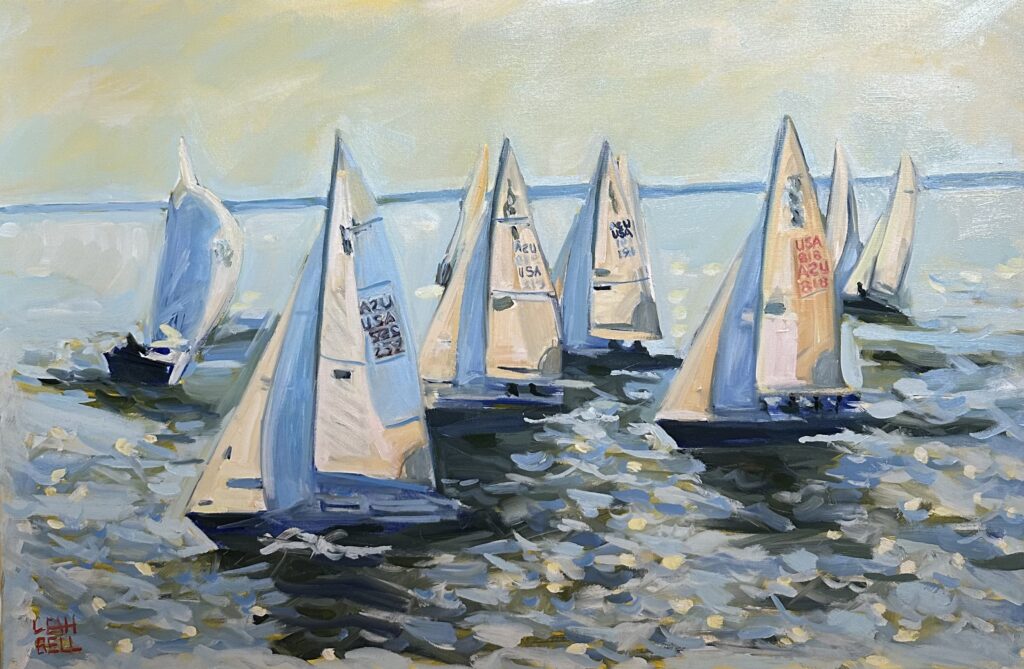 Every year, we partner with the Maryland Federation of Art to host a competition for the year’s feature image for the regatta. Four finalists are selected through a people’s choice vote online and the winer is chosen by in-person vote at the spring art reception.